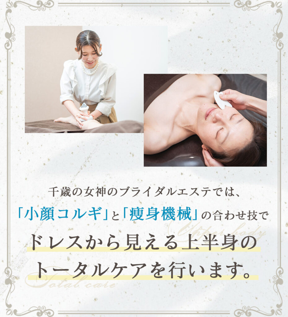 当サロンのブライダルエステ施術は、フェイスラインからボディまでトータルでケアし、最高の花嫁姿をサポートします。