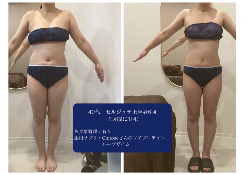 今回は、実際に「千歳の女神」に通われた40代女性のお客様にご協力いただき、**セルジュテ上半身6回(2週間に1回ペース)**のビフォーアフターを写真でご紹介します。
