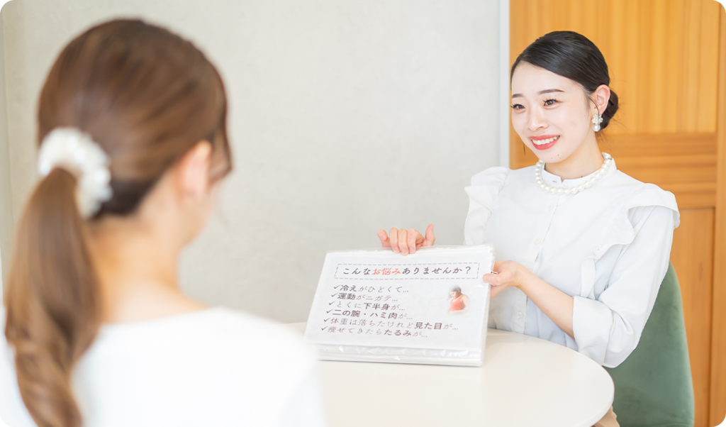 などといった、お客様それぞれのお悩みにお応えし、全スタッフがダイエット成功者だからこそできるアドバイスをさせていただきます。